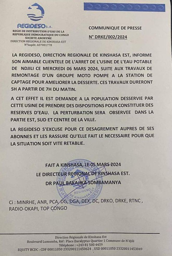 La direction régionale de la REGIDESO de Kinshasa a informé son aimable clientèle de l’arrêt de l’usine de l’eau potable de Ndjili ce 06 mars 2024, suite aux travaux de remontage d’un groupe moto pompe à la station de captage pour améliorer la desserte.