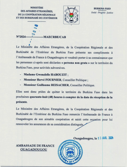 Dans un nouvel épisode de la rupture entre Paris et Ouagadougou, les autorités du Burkina Faso ont déclaré trois diplomates français « persona non grata ».Parmi eux figurent Gwenaëlle Habouzit et les conseillers politiques Hervé Fournier et Guillaume Reisacher.