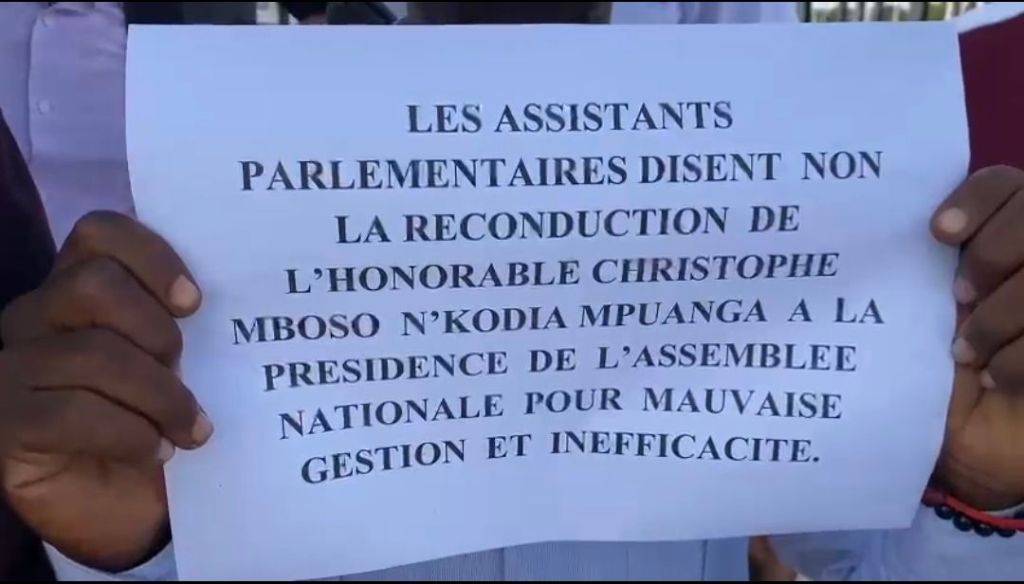 Dans un cri unanime pour la justice, les assistants parlementaires de la 3ème législature de la 3ème République ont lancé un appel pressant à l’Assemblée Nationale, ce Mardi 23 Avril a l’Esplanade du Palais du peuple. Caliquots en main on pouvait lire clairement leur rejet du président Christophe Mboso, président du Bureau d’âge et candidat à sa propre succession à la tête de la chambre basse du Parlement congolais.Les Assistants exigent la reconnaissance de leurs droits et la fin d’une série d’injustices qui perdurent.