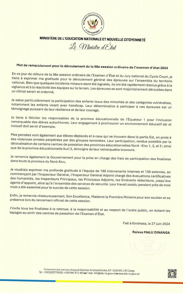 La 58e session ordinaire de l’Examen d’État et du Jury national du Cycle Court s’est achevée avec succès sur l’ensemble du territoire national. Raissa Malu Dinanga, ministre d’Etat ministre de l’Education Nationale et Nouvelle Citoyenneté, dans un communiqué officiel, a exprimé sa profonde gratitude pour le bon déroulement des épreuves.