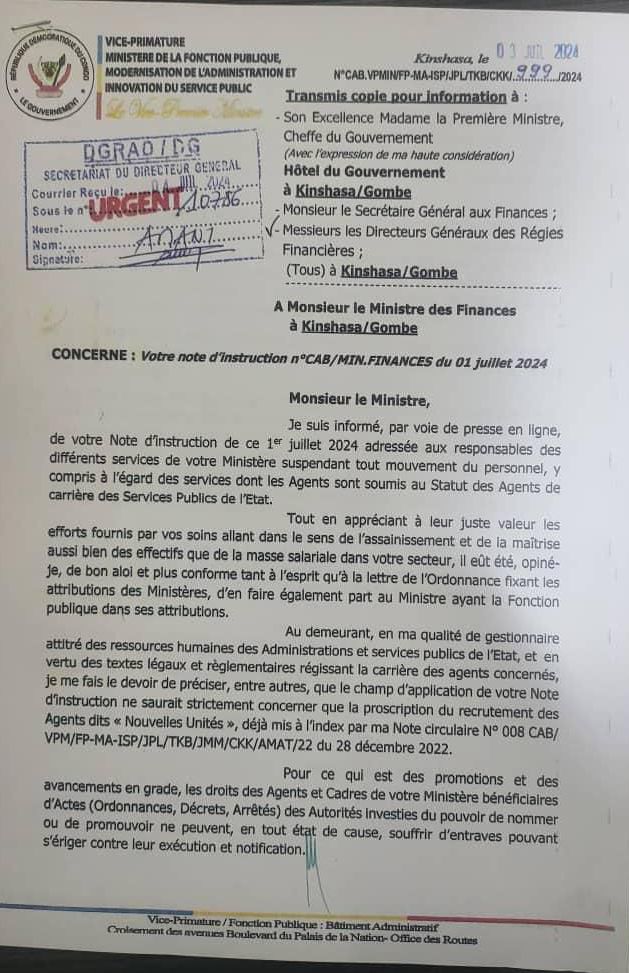 Kinshasa, le 5 Juillet 2024 — Dans une lettre adressée au ministre des finances, Doudou Fwamba, le Vice Premier Ministre et Ministre de la fonction publique, de la modernisation de l’administration et innovation du service public, Jean-Pierre Lihau Ebua, soulève des préoccupations majeures concernant les mouvements du personnel au sein du Ministère des finances.