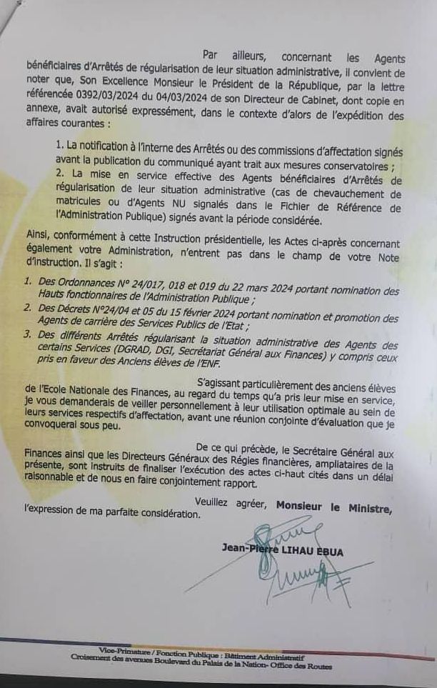 En outre, certains actes, tels que les Ordonnances portant nomination des Hauts fonctionnaires de l’Administration Publique, les Décrets portant nomination et promotion des Agents de carrière des Services Publics de l’État, ainsi que les Arrêtés régularisant la situation administrative des Agents de certains Services, ne devraient pas être concernés par la Note d’instruction.