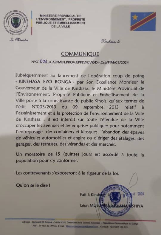 Kinshasa, RDC – Dans le cadre de l’opération « Coup de Poing – KINSHASA EZO BONGA » lancée par Son Excellence Monsieur le Gouverneur de la Ville de Kinshasa, le Ministère Provincial de l’Environnement, de la Propreté Publique et de l’Embellissement de la Ville a émis un communiqué important à l’attention de tous les habitants de Kinshasa.