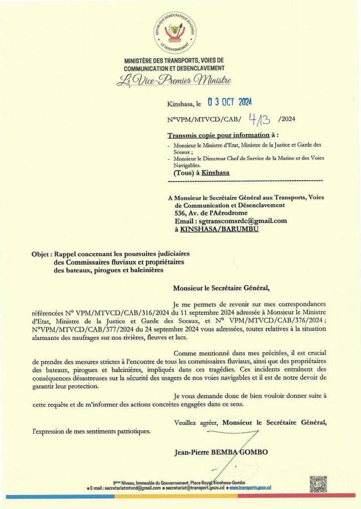 Face à cette situation désastreuse, Jean-Pierre Bemba, vice-Premier ministre et ministre des Transports, Voies de Communication et Désenclavement, a choisi la voie de la fermeté. Dans une correspondance adressée ce Jeudi 3 Octobre au Secrétaire général de son ministère, il a rappelé ses précédentes lettres des 11 et 24 septembre, adressées au ministre de la Justice, Constant Mutamba, et au Secrétaire général aux Transports. Il y soulignait l’impératif de poursuivre en justice les commissaires fluviaux et les propriétaires des bateaux, pirogues et baleinières impliqués dans ces naufrages.