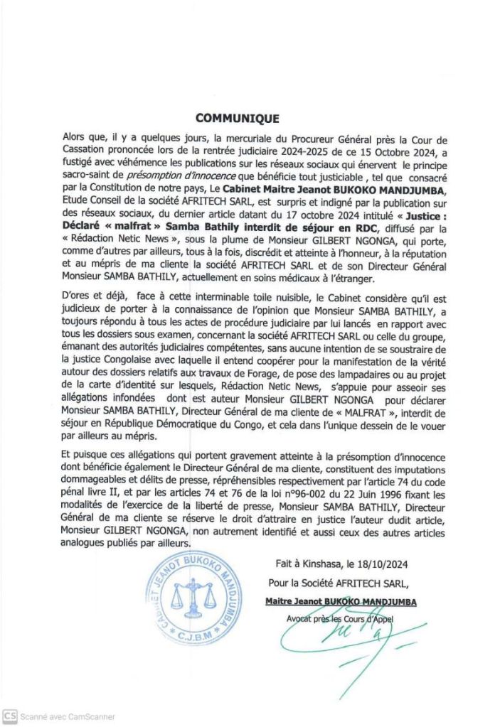 Le cabinet Maître Jeanot Bukoko Mandjumba, chargé de l’étude conseil de la société AFRITECH SARL, a exprimé sa profonde indignation suite à la publication d’un article sur les réseaux sociaux. Daté du 17 octobre 2024 et rédigé par Gilbert Ngonga, cet article qualifie le Directeur Général d’AFRITECH SARL, Monsieur Samba Bathily, de « malfrat » et annonce son interdiction de séjour en République Démocratique du Congo (RDC).