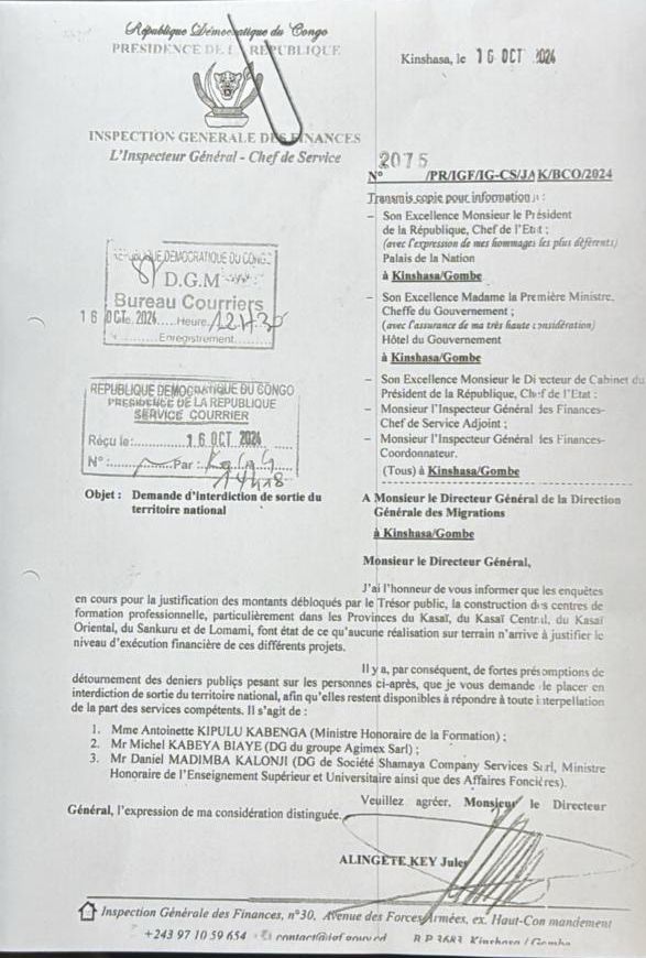 Daniel Madimba Kalonji, ancien ministre de la Recherche scientifique et ex-député UDPS devenu patron de sa propre entreprise, Shamaya Company Service Sarl, et Michel Kabeya Biaye, Directeur général du Groupe Agimex Sarl, sont également impliqués dans ce dossier. Selon un courrier de l’Inspection Générale des Finances (IGF) daté du 16 octobre et transmis à la Direction Générale de Migration (DGM) le même jour, les personnalités impliquées ont été auditionnées à l’IGF. Elles auraient, selon certaines indiscrétions, utilisé cet argent à des fins personnelles, et leurs comptes bancaires indiquent un solde nul.