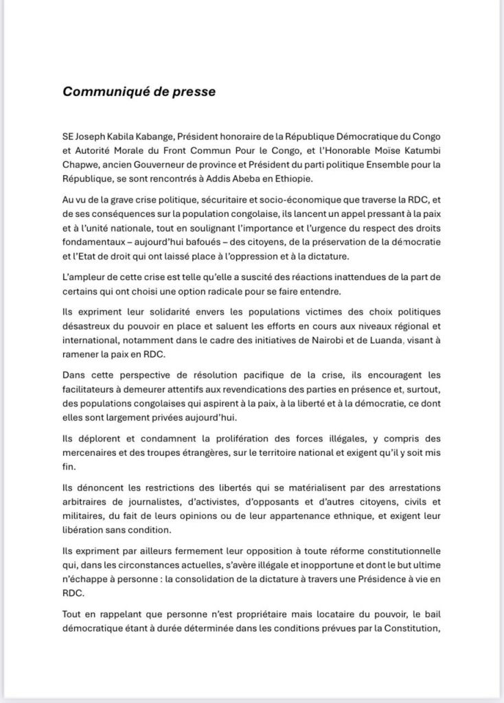 L’ancien président de la République démocratique du Congo (RDC), Joseph Kabila, et l’ancien gouverneur Moïse Katumbi ont tenu une rencontre inédite à Addis-Abeba, en Éthiopie. Les deux figures politiques ont exprimé leurs préoccupations face à la crise multidimensionnelle qui secoue la RDC, appelant à la paix, à l’unité nationale et au respect des droits fondamentaux.