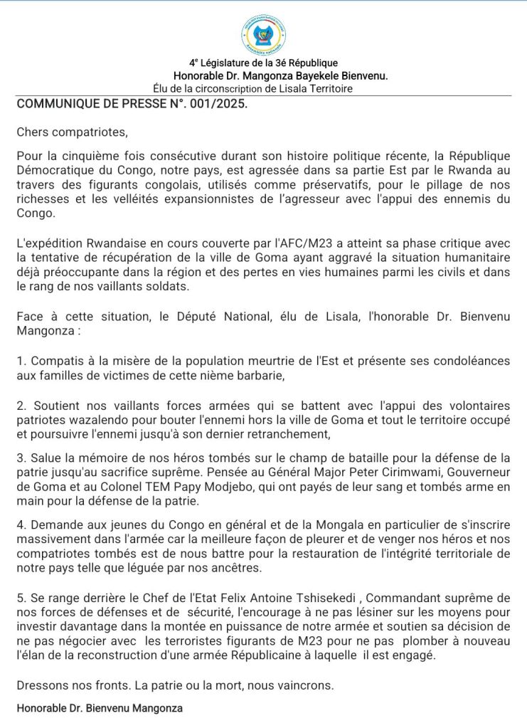 KINSHASA – Dans un communiqué poignant, l’honorable Dr. Bienvenu Mangonza, Député National élu de Lisala, a exprimé sa profonde indignation face à l’agression répétée de la République Démocratique du Congo par le Rwanda. Il a dénoncé l’utilisation de figurants congolais par l’agresseur pour piller les richesses du pays et poursuivre des velléités expansionnistes, avec le soutien des ennemis du Congo.