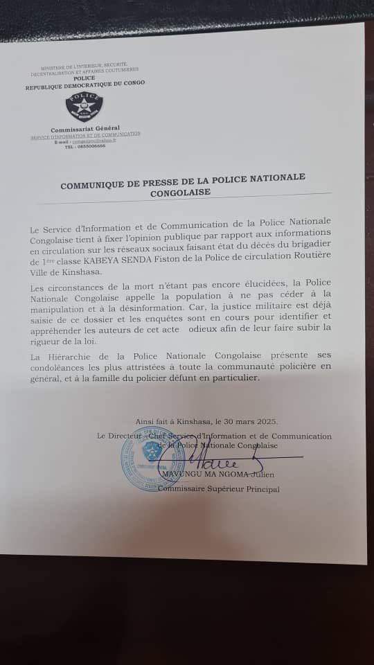 La hiérarchie de la Police nationale congolaise a exprimé ses condoléances à la famille du défunt et à la communauté policière. Cependant, l’absence de communication officielle de la Primature continue d’alimenter les spéculations et les tensions.