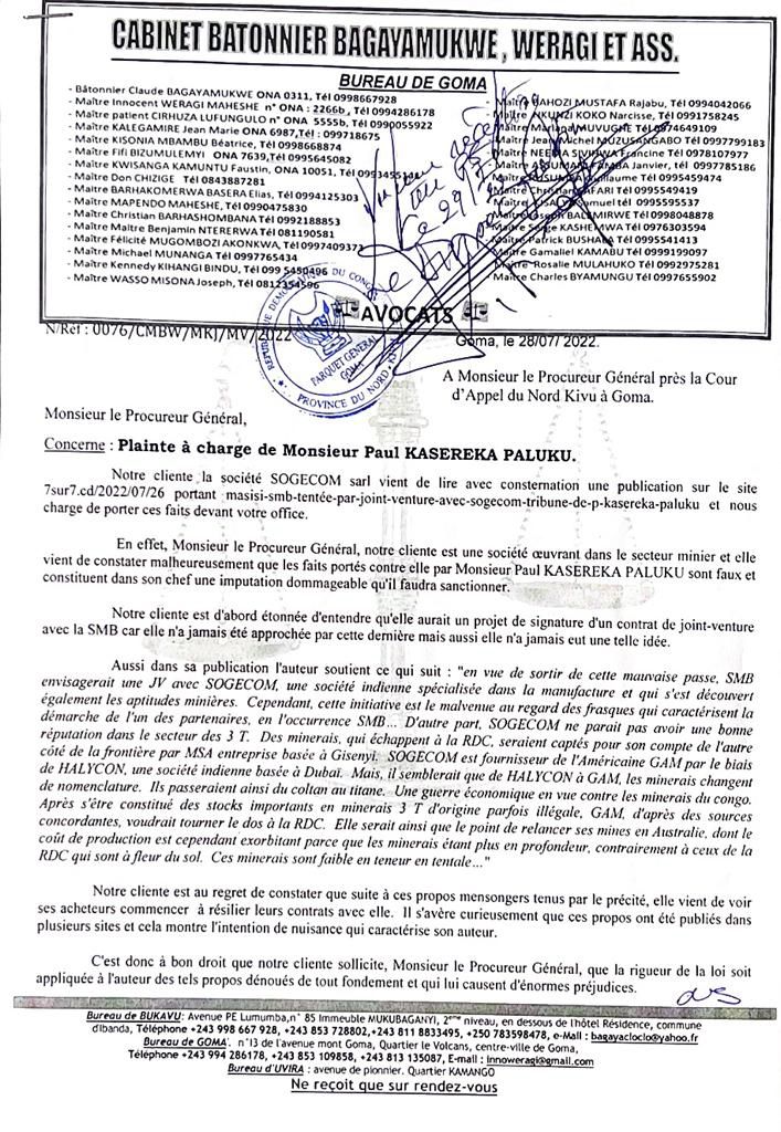 SOGECOM s’interroge sur l’origine de ces accusations, rappelant que Paul Paluku est l’auteur de plusieurs articles à charge depuis 2022, dont « Fraude minière dans le Masisi : SOGECOM démasquée ». Ces publications avaient fait l’objet de plaintes judiciaires restées sans suite, l’auteur n’ayant jamais répondu aux convocations légales.