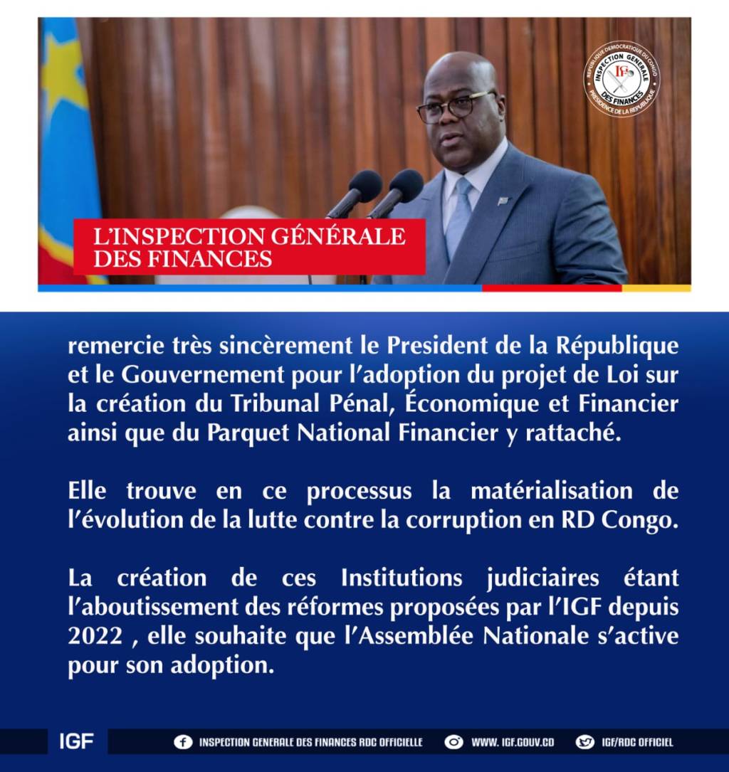 Kinshasa – L’Inspection Générale des Finances (IGF) a exprimé sa reconnaissance envers le Président de la République et le Gouvernement pour l’adoption du projet de loi instaurant le Tribunal Pénal, Économique et Financier, accompagné du Parquet National Financier. Cette réforme audacieuse marque une étape capitale dans le combat contre la corruption et les détournements des ressources publiques en République Démocratique du Congo.