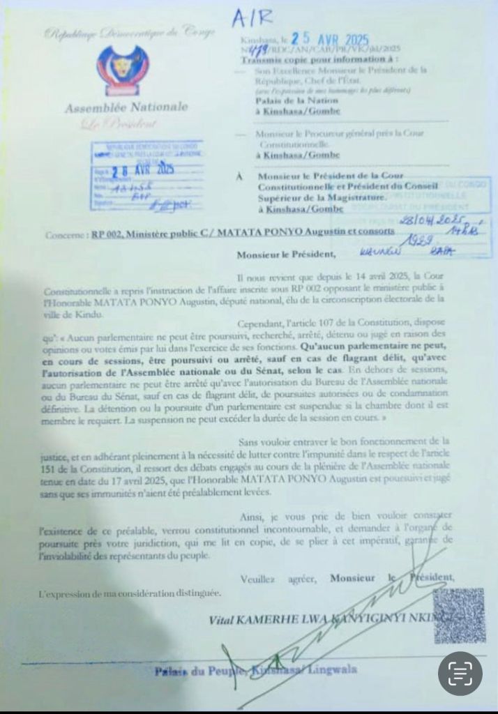 Face à cette situation, le président de l’Assemblée nationale, Vital Kamerhe, a adressé une correspondance officielle à la Cour Constitutionnelle, exigeant le respect strict du cadre légal. Dans cette lettre, il rappelle que l’inviolabilité des représentants du peuple est un principe intangible et que toute procédure engagée sans la levée formelle des immunités parlementaires constitue une entorse au texte constitutionnel.