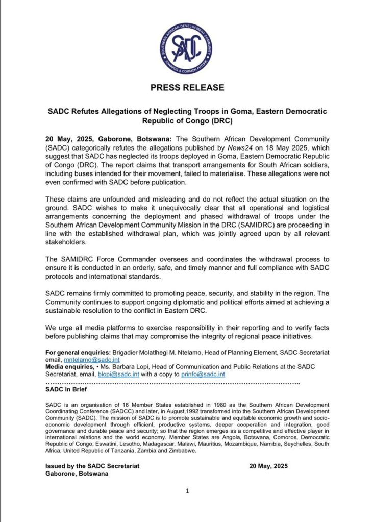 La Communauté de développement de l’Afrique australe (SADC) rejette fermement les allégations de négligence envers ses troupes déployées à Goma, dans l’Est de la République démocratique du Congo (RDC). Ces accusations, relayées par News24 le 18 mai 2025, prétendent que le déploiement de soldats sud-africains aurait souffert de lacunes logistiques, notamment le manque de transport prévu.