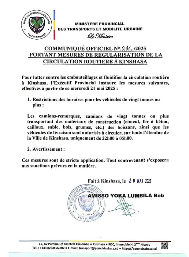 D’après le communiqué officiel signé par le ministre provincial des Transports et Mobilité Urbaine, Amisso Yoka Lumbila Bob, les camions-remorques et véhicules de 20 tonnes ou plus transportant des matériaux de construction (ciment, fer à béton, sable, bois, etc.), des boissons ou effectuant des livraisons ne pourront circuler qu’entre 22h00 et 5h00 du matin. Cette restriction vise à libérer les routes en journée et améliorer la fluidité du trafic.
