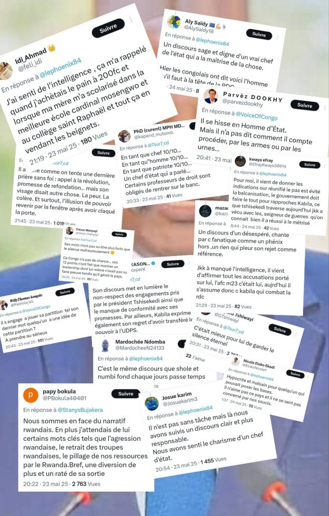 Parmi les soutiens de Joseph Kabila, plusieurs voix ont loué la clarté et la maturité de son propos. Certains y ont vu l’expression d’un véritable homme d’État, capable de donner des orientations pour une sortie de crise et une réunification du pays. « Un discours sage et digne d’un vrai chef d’État qui a la maîtrise de la chose », souligne un internaute, tandis qu’un autre estime qu’il « vient de donner les indications pour éviter la balkanisation. »Un commentaire enthousiaste résume ce sentiment : « 45 minutes de pur bonheur, sans insultes… mais remplies de sagesse et de maturité. L’homme d’État vient de parler et d’assurer qu’il jouera sa partition. »