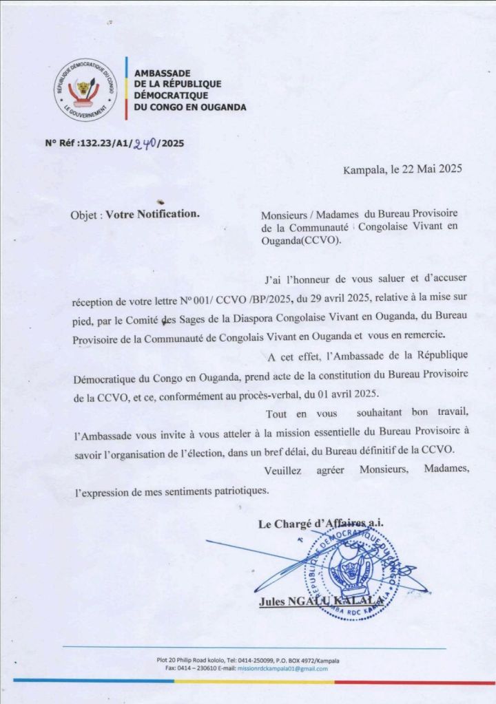 Le 22 mai 2025, une nouvelle équipe dirigeante a été installée, comme le confirme la lettre réf. 132.23/A1/240/2025 émise par l’ambassade congolaise en Ouganda. Cette reconnaissance officielle confère pleine légitimité à la nouvelle direction, qui collabore avec les autorités congolaises et ougandaises pour défendre les intérêts des Congolais établis dans le pays.