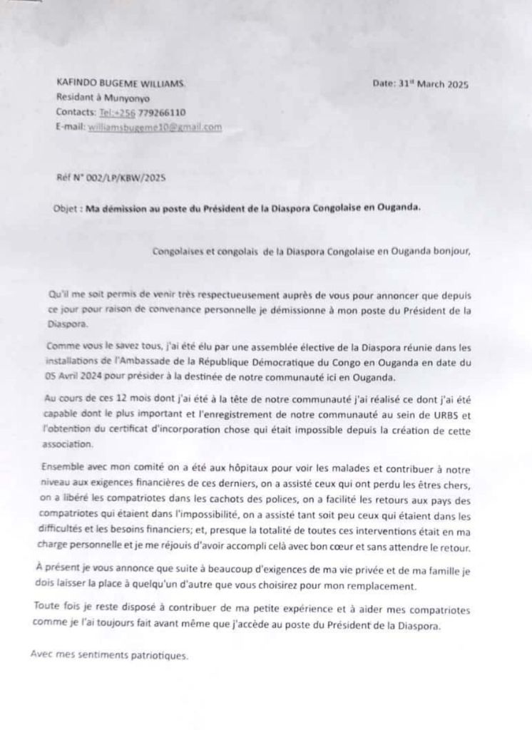 Williams Bugeme Kafindo a quitté ses fonctions le 31 mars 2025, comme en atteste la lettre officielle référencée n°002/LP/KBW/2025. Sa démission a été entérinée par le Chargé d’affaires a.i. de l’ambassade de la RDC en Ouganda, le responsable de la diaspora et le Comité des Sages de la communauté congolaise. Dès lors, toute prétention à représenter la CCVO est juridiquement irrecevable.