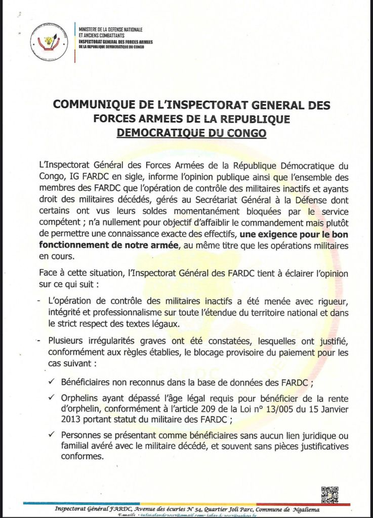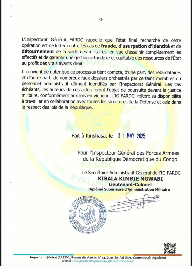 Dans son communiqué du 31 mai 2025, l’Inspection Générale des FARDC a réaffirmé que l’objectif final de cette opération est de lutter contre la fraude et le détournement des soldes militaires, garantissant une gestion orthodoxe des ressources de l’État. Elle a également précisé que les auteurs d’irrégularités seront poursuivis devant la justice militaire conformément aux lois en vigueur.