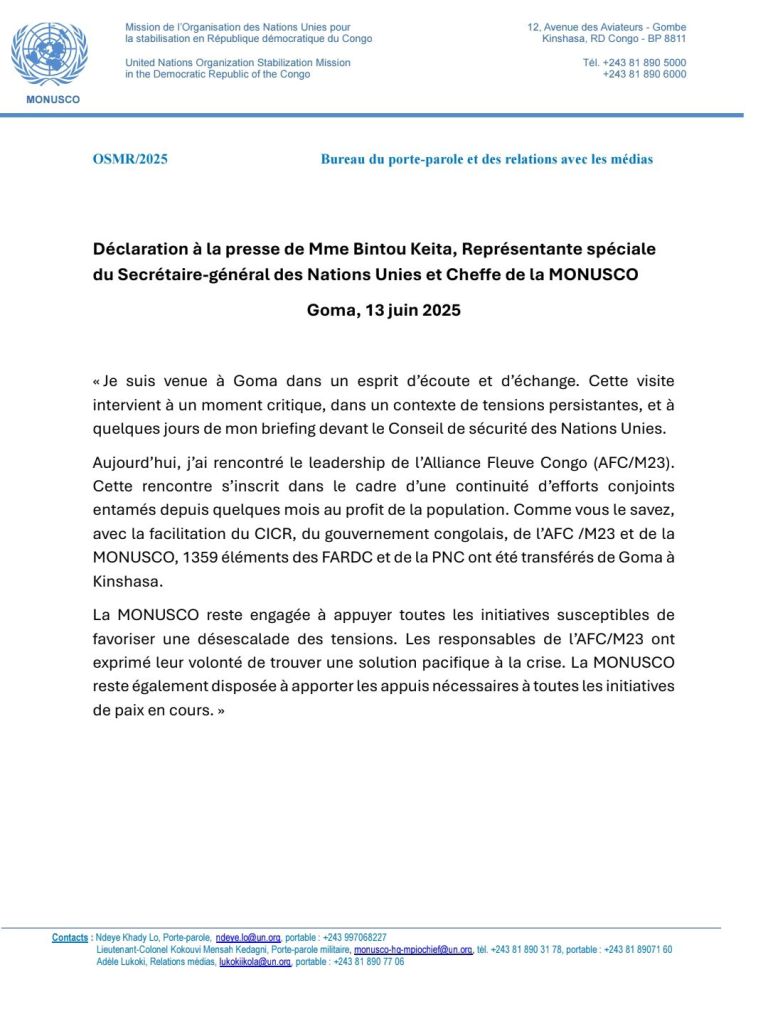 Dans son communiqué, Mme Keïta a réaffirmé l’engagement de la MONUSCO à soutenir les efforts de paix, rappelant notamment le transfert de 1359 éléments des FARDC et de la PNC de Goma à Kinshasa, une opération menée avec la facilitation du CICR, du gouvernement congolais et de l’AFC/M23. Mais au-delà des déclarations officielles, plusieurs observateurs estiment que cette visite intervient dans un contexte diplomatique plus large. Pour certains, elle traduit un message clair des États-Unis, qui ont récemment insisté sur la nécessité d’un accord de paix entre le M23 et le gouvernement congolais avant toute signature d’un engagement entre la RDC et le Rwanda. Un processus qui, selon Washington, doit être conditionné au retrait des troupes rwandaises encore présentes sur le sol congolais.