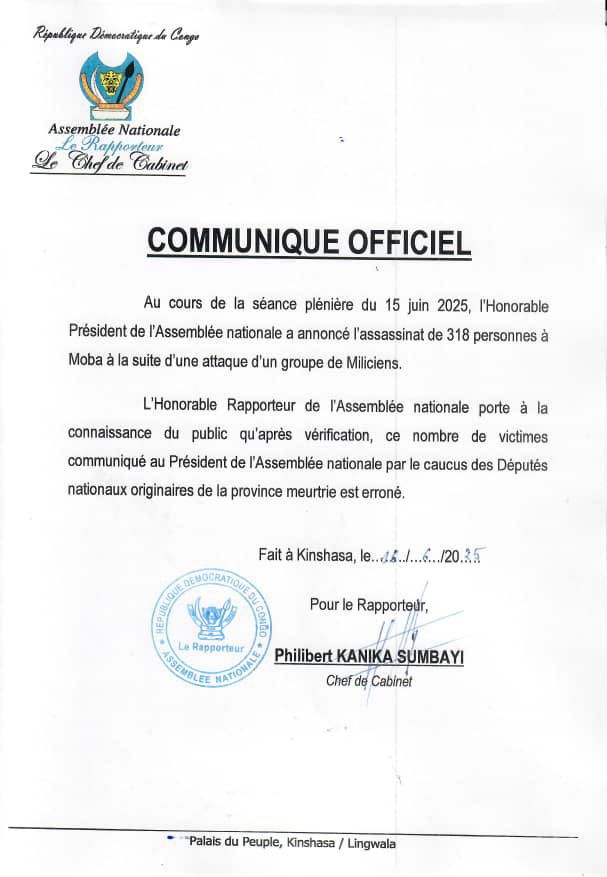 Face à l’emballement médiatique et politique, le député UDPS John Banza a finalement précisé que les 318 morts évoqués ne concernaient pas un seul massacre, mais représentaient le cumul des violences survenues à Moba au cours des quatre dernières années. L’Assemblée nationale, par la voix du chef de cabinet du rapporteur, Philibert Kanika Sumbayi, a reconnu l’erreur dans un communiqué officiel.
