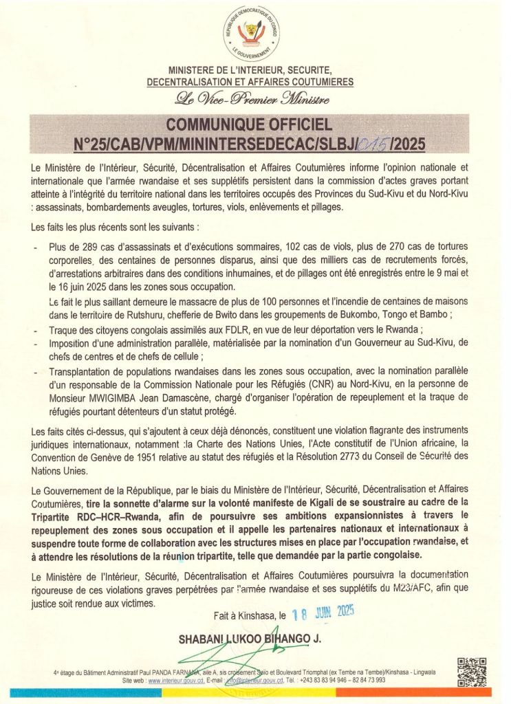 Ces accusations résonnent fortement à Kinshasa, où le ministère de l’Intérieur avait déjà tiré la sonnette d’alarme sur ce qu’il qualifiait de stratégie de “transplantation démographique” orchestrée par le Rwanda. Selon les autorités congolaises, Kigali chercherait à modifier la composition ethnique des zones occupées par le M23 en vidant les territoires congolais de leurs habitants d’origine pour les remplacer progressivement par des populations étrangères acquises à sa cause.