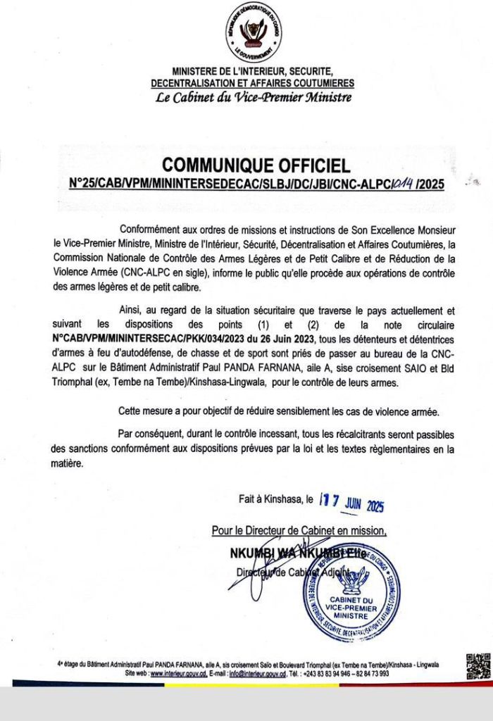 Les détenteurs d’armes à feu à usage d’autodéfense, de chasse ou de sport sont invités à se présenter au siège de la CNC-ALPC, situé dans l’aile A du bâtiment administratif Paul Panda Farnana, au croisement des avenues Saio et Boulevard Triomphal (ex Tembe na Tembe), dans la commune de Lingwala à Kinshasa, afin de faire vérifier et enregistrer leurs armes.
