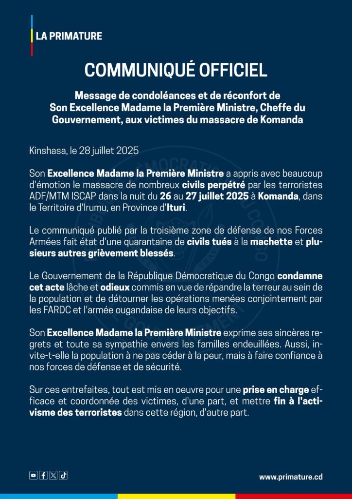 Dans un communiqué publié le 28 juillet 2025, Son Excellence Madame la Première Ministre, Cheffe du Gouvernement, a exprimé avec une vive émotion ses condoléances aux familles endeuillées et réaffirmé le soutien total de l’État aux victimes. « Le Gouvernement condamne avec fermeté cet acte lâche et odieux, visant à répandre la terreur et à saper les efforts conjoints des FARDC et de l’armée ougandaise », peut-on lire.