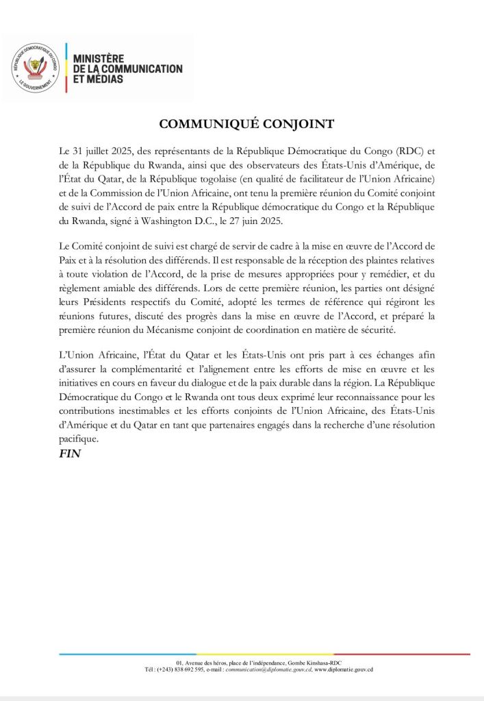 Le 31 juillet 2025 marque un tournant diplomatique dans la région des Grands Lacs. À l’issue de la première réunion du Comité conjoint de suivi de l’Accord de Paix entre la République Démocratique du Congo et la République du Rwanda, tenue à Kinshasa, les représentants des deux États ont entamé la mise en œuvre concrète du document signé à Washington D.C. le 27 juin dernier.