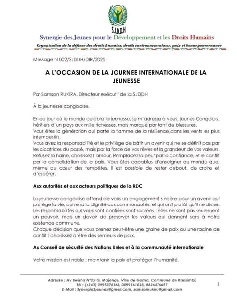 À l’occasion de la Journée internationale de la jeunesse, célébrée ce 12 août, Samson RUKIRA, Directeur exécutif de la synergie des Jeunes pour le développement et droits humains (SJDDH), a livré un message fort à la jeunesse congolaise, aux autorités nationales et à la communauté internationale.