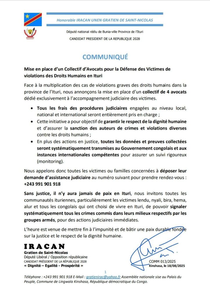 Kinshasa, 18 août 2025 – Face à la persistance de l’insécurité en République démocratique du Congo, le député national Gratien Iracan monte au créneau. Après avoir pointé du doigt l’inefficacité des réponses gouvernementales, il élargit son combat en déposant une plainte contre un officier subalterne de l’armée congolaise, qu’il accuse de menaces et d’outrages à son encontre.
