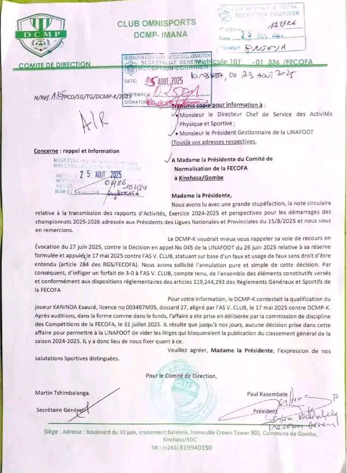 La réunion du 8 septembre, convoquée par la Fédération congolaise de football association (FECOFA), est au cœur de la controverse. Elle visait à soumettre à la CAF une liste de quatre clubs qualifiés pour les compétitions interclubs. Or, selon les deux clubs contestataires, cette réunion est entachée de graves irrégularités: violation d’une décision du Tribunal arbitral du sport (TAS), implication illégitime de certains clubs dans une décision juridiquement contraignante, soupçons de corruption et d’ingérence politique, et transmission d’un classement « vicié » à la CAF.