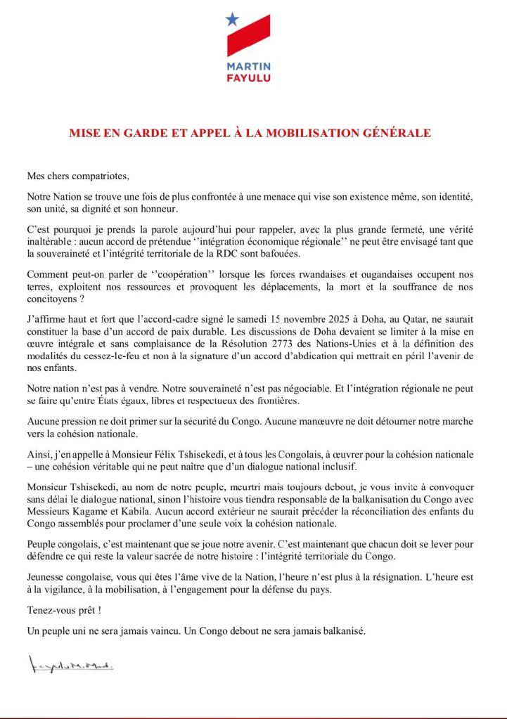 Fayulu dénonce avec fermeté l’accord-cadre signé le 15 novembre à Doha, au Qatar, qu’il qualifie d’« accord d’abdication » contraire aux intérêts du peuple congolais. Selon lui, les discussions de Doha auraient dû se limiter à l’application stricte de la Résolution 2773 des Nations Unies et à la mise en œuvre d’un cessez-le-feu, plutôt que d’ouvrir la voie à une intégration régionale jugée prématurée.