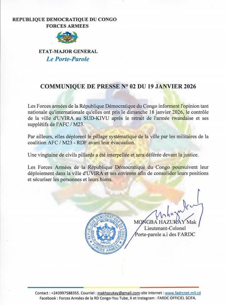 Le communiqué de presse n°02 du 19 janvier 2026, signé par le Lieutenant-Colonel MONGBA HAZUKAY Mak, porte-parole a.i des FARDC, confirme que les troupes congolaises ont repris le contrôle de la ville d’Uvira le dimanche 18 janvier, suite au retrait des forces rwandaises et de leurs alliés du M23/AFC. Toutefois, ce retrait s’est accompagné d’un pillage systématique de la ville, laissant derrière lui un climat de désolation. Une vingtaine de civils impliqués dans ces actes ont été interpellés et seront traduits en justice.