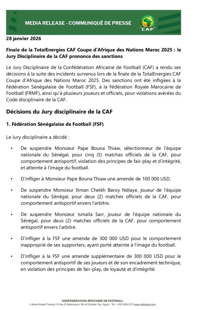 Du côté sénégalais, le sélectionneur Pape Bouna Thiaw a été suspendu pour cinq matches et condamné à une amende de 100 000 dollars, pour comportement jugé contraire au fair-play. Deux cadres de l’équipe, Iliman Ndiaye et Ismaïla Sarr, ont écopé chacun de deux matches de suspension pour leurs gestes envers l’arbitre. La Fédération Sénégalaise de Football, elle, devra s’acquitter de plus de 600 000 dollars d’amendes, sanctionnant à la fois les débordements de ses supporters et l’attitude de sont encadrement technique.